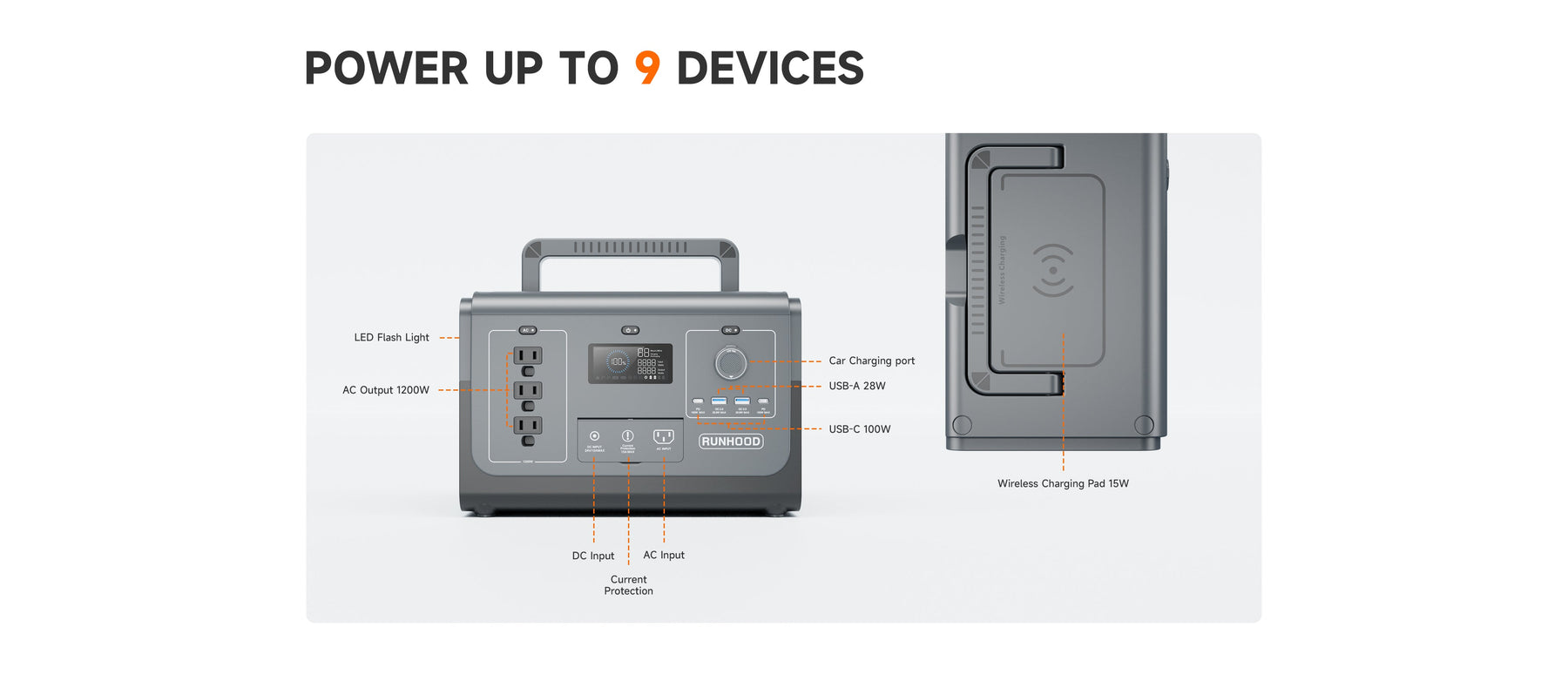 - Featuring 3X1200W pure sine wave AC output, 5 DC outlets (2USB-A 28W, 2USB-C 100W, 1Car outlet), and 115W wireless charging, the Runhood Rallye 1200 can simultaneously charge up to 9 devices while accommodating various plug requirements.